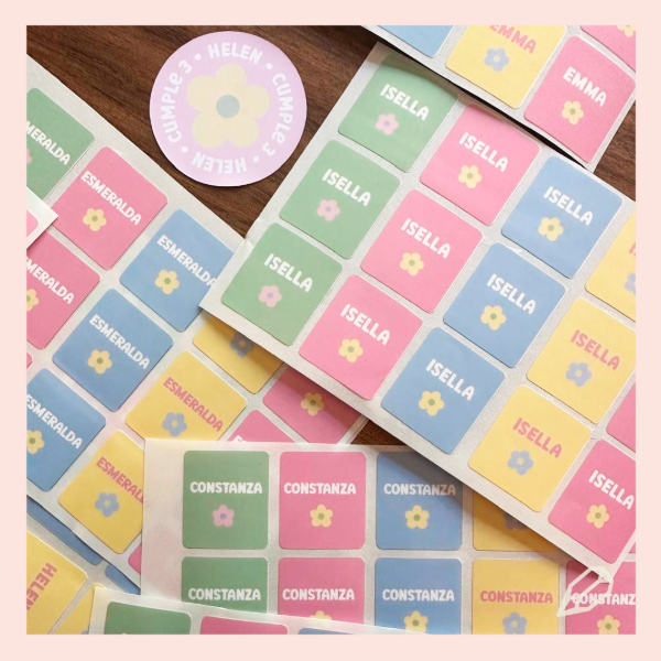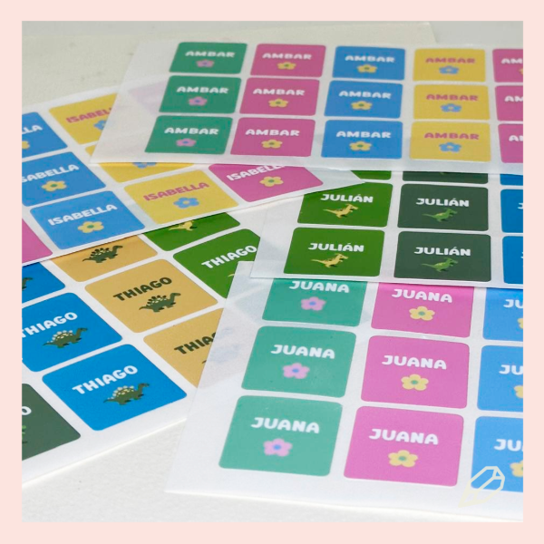 Stickers troquelados en vinilo, ideal para botellitas y tuppers, medida de 9x14 cm.Diseño según temática elegida x 10 unidades, cada pliego con distinto nombre. Presentación indiividual con cabezal personalizado.